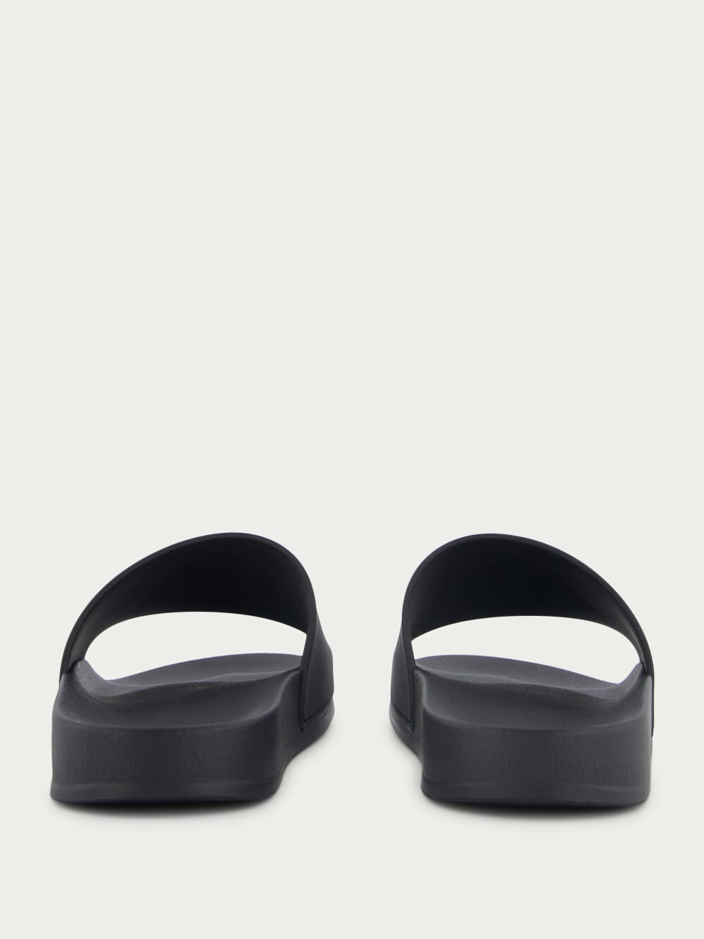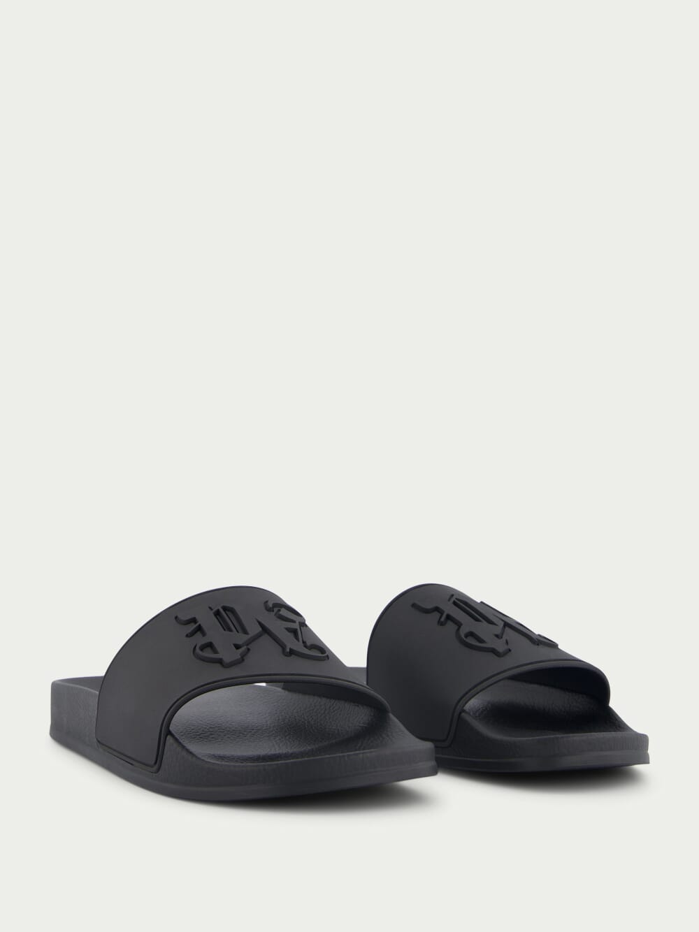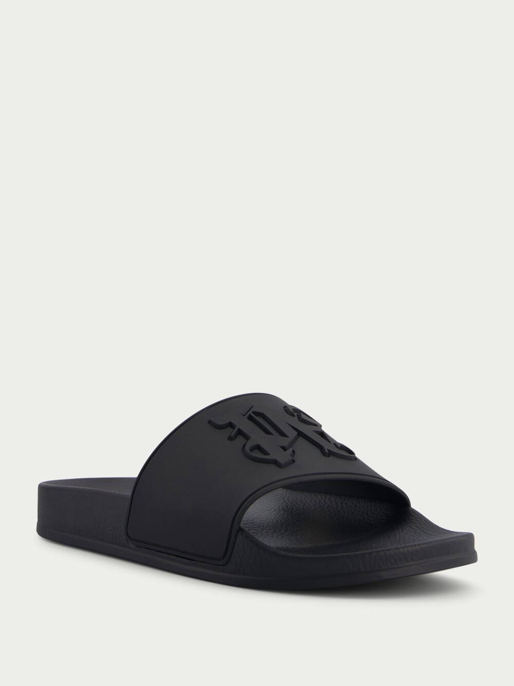 Monogram-Embossed Slides, featuring an elegant embossed logo on the front for a touch of sophistication. These slides boast a convenient slip-on style, offering both ease and style. The open toe design and flat sole ensure comfort with every step. Enjoy the comfort of a moulded footbed, perfect for all-day wear. Please note, when purchasing this unisex item, refer to standard men's sizing for the perfect fit.