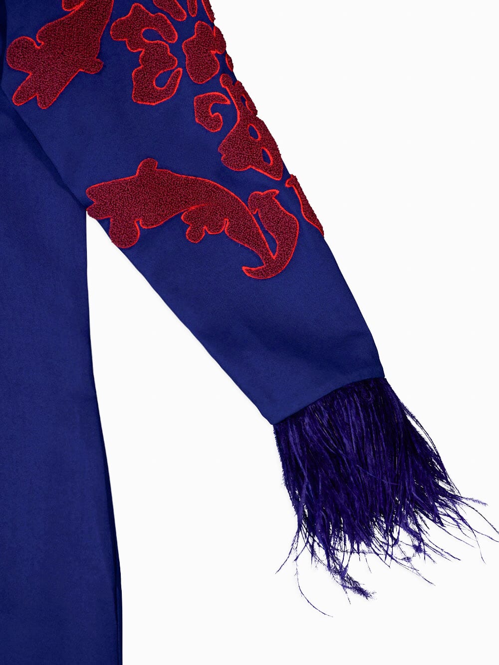 Bellona Turtle Neck Embroidered Dress, featuring an exquisite embroidered motif that exudes elegance. This dress boasts feather detailing at the cuffs, adding a touch of contemporary flair to its design. The timeless turtle neck and below-knee length make it perfect for various occasions. With long sleeves, it's ideal for transitional seasons.