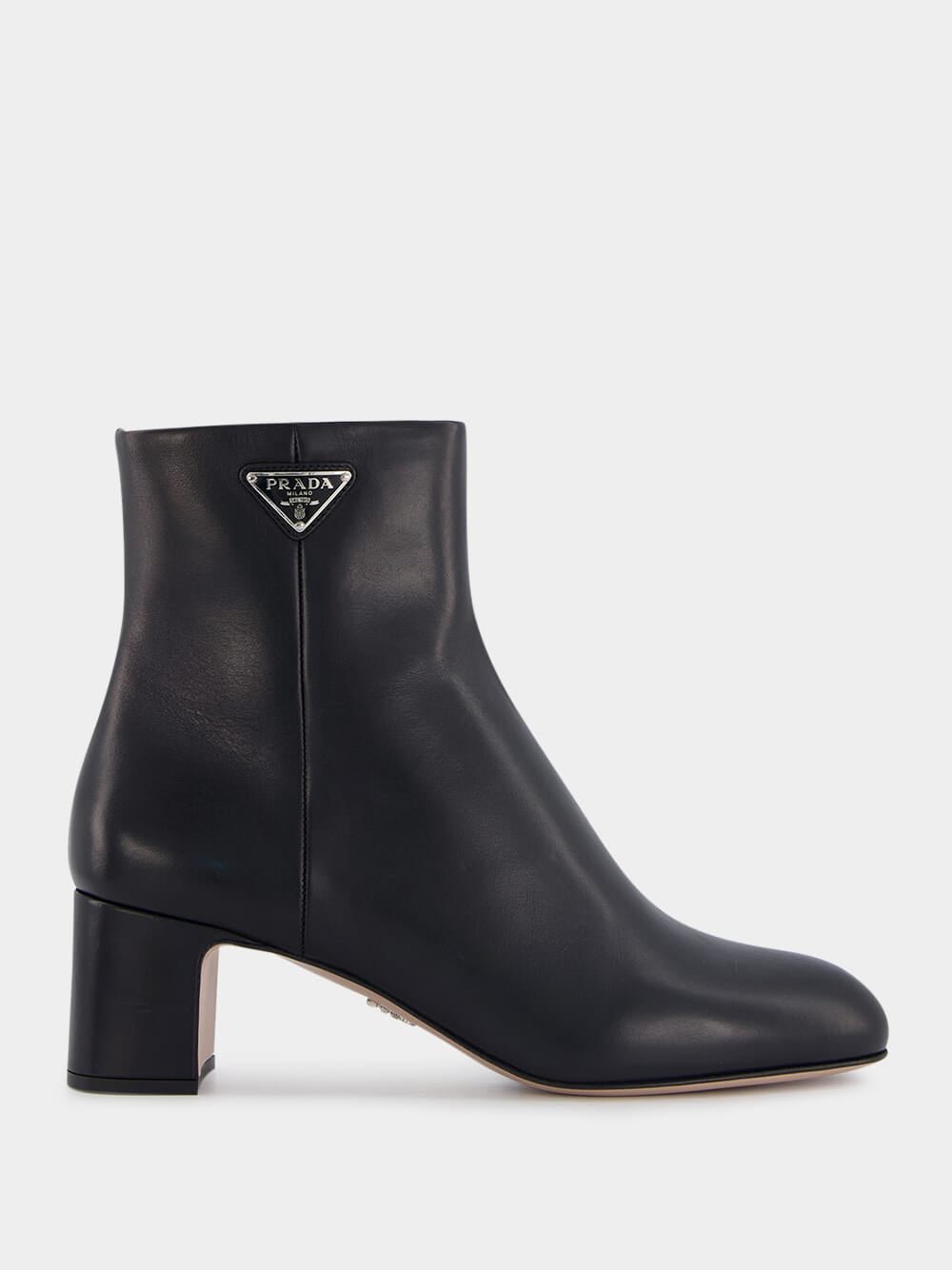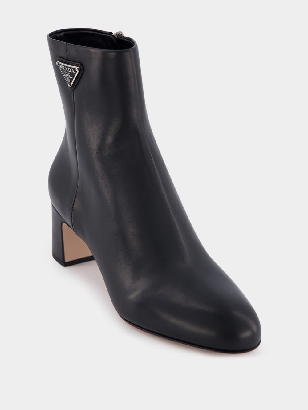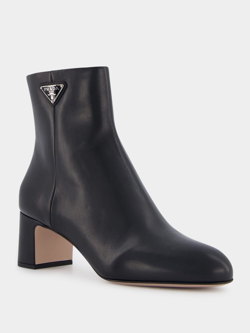 Leather Booties, feature a luxurious leather lining and enameled metal triangle logo, these booties exude timeless elegance. The side zipper closure ensures easy wearing, while the 14 cm boot leg adds a touch of allure. Experience supreme quality with the leather sole and a touch of brand authenticity with the metal lettering logo. Complete your ensemble with the 55 mm leather-covered heel for a perfect blend of fashion and practicality.