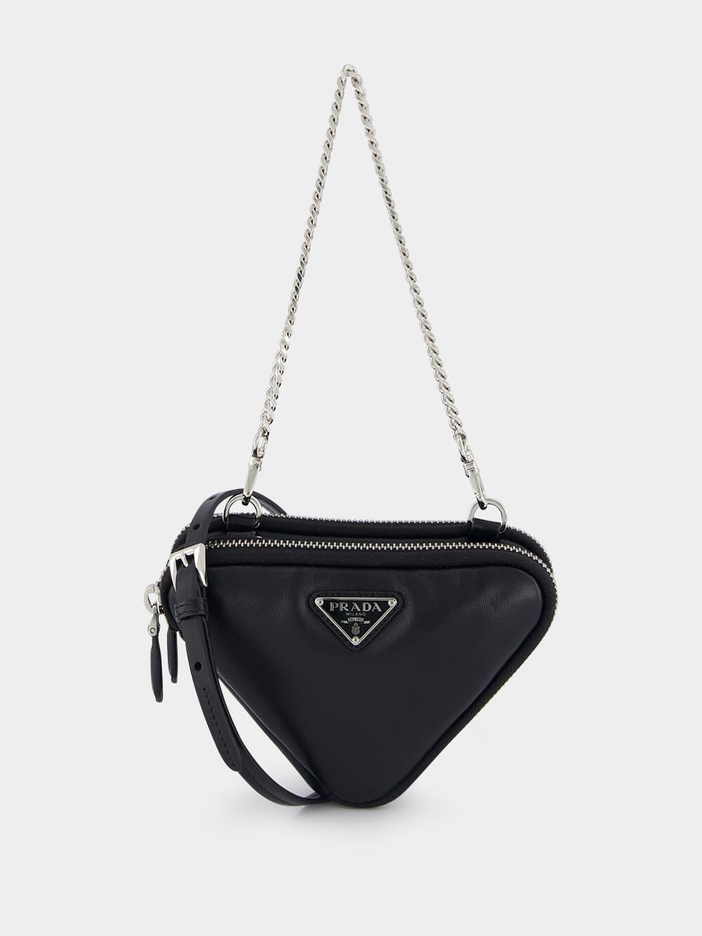 Nappa Leather Mini-Pouch, designed with a convenient zipper closure, this pouch ensures the safety of your essentials. The enameled metal triangle logo adds a touch of sophistication to its elegant silhouette. With a detachable and adjustable leather shoulder strap, as well as a detachable chain handle, this mini-pouch offers versatile carrying options. Lined with plush Nappa leather, it provides a sleek and indulgent interior.