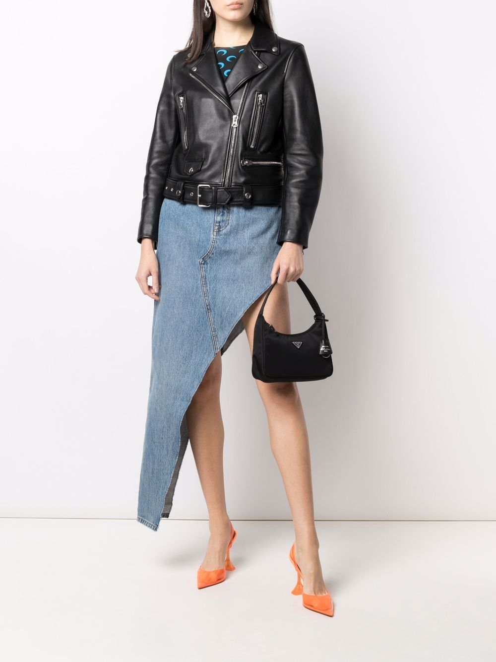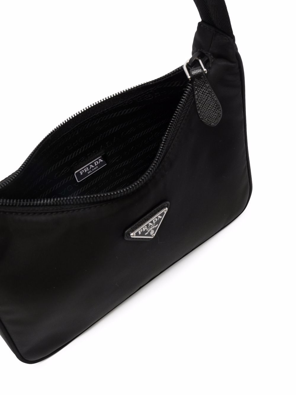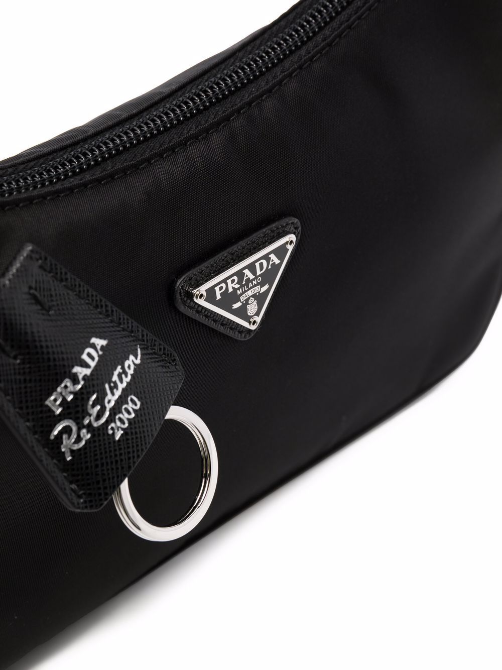 Prada re-edition 2000 mini shoulder bag made of black re-nylon with iconic enameled metal triangle logo.