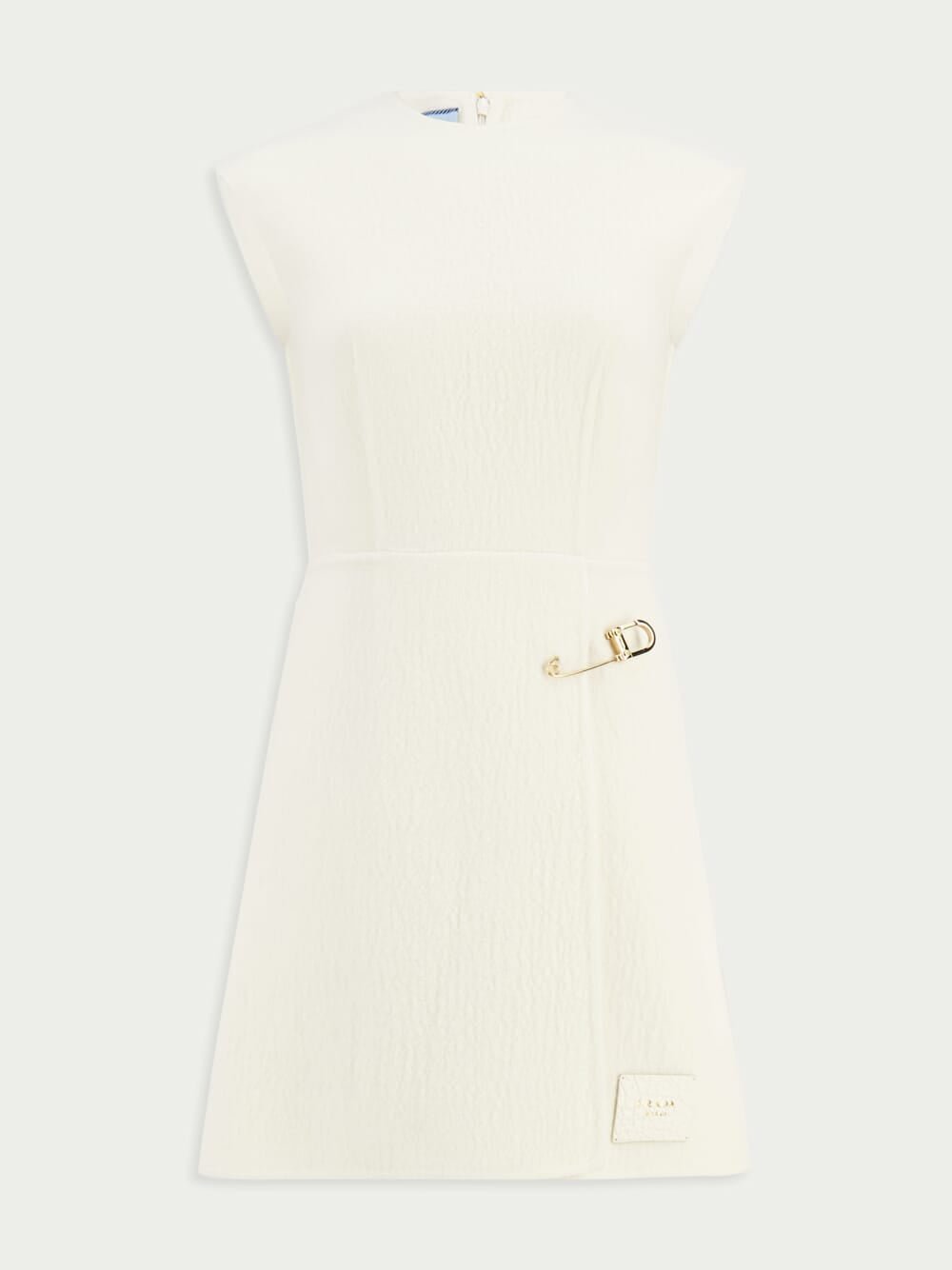 Safety Pin-Detail Minidress, featuring a captivating logo patch to the front for a touch of authenticity. The safety pin detail adds a rebellious charm to the round neck, sleeveless design. With a slight flare that flatters the silhouette, a rear zip fastening ensures easy wear. This thigh-length minidress is completed with a straight hem, creating a chic and contemporary look.