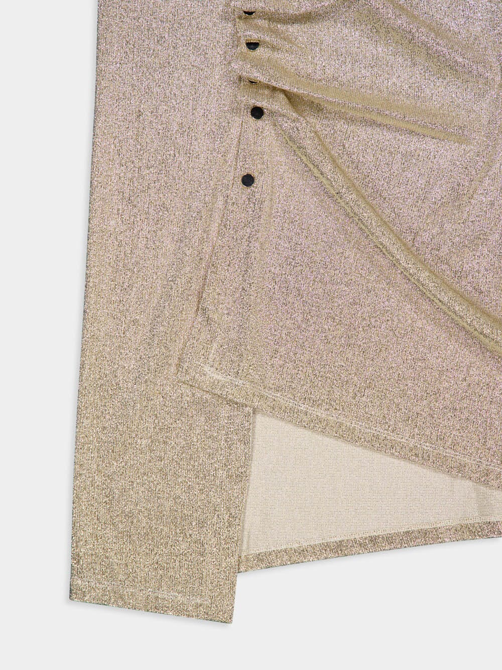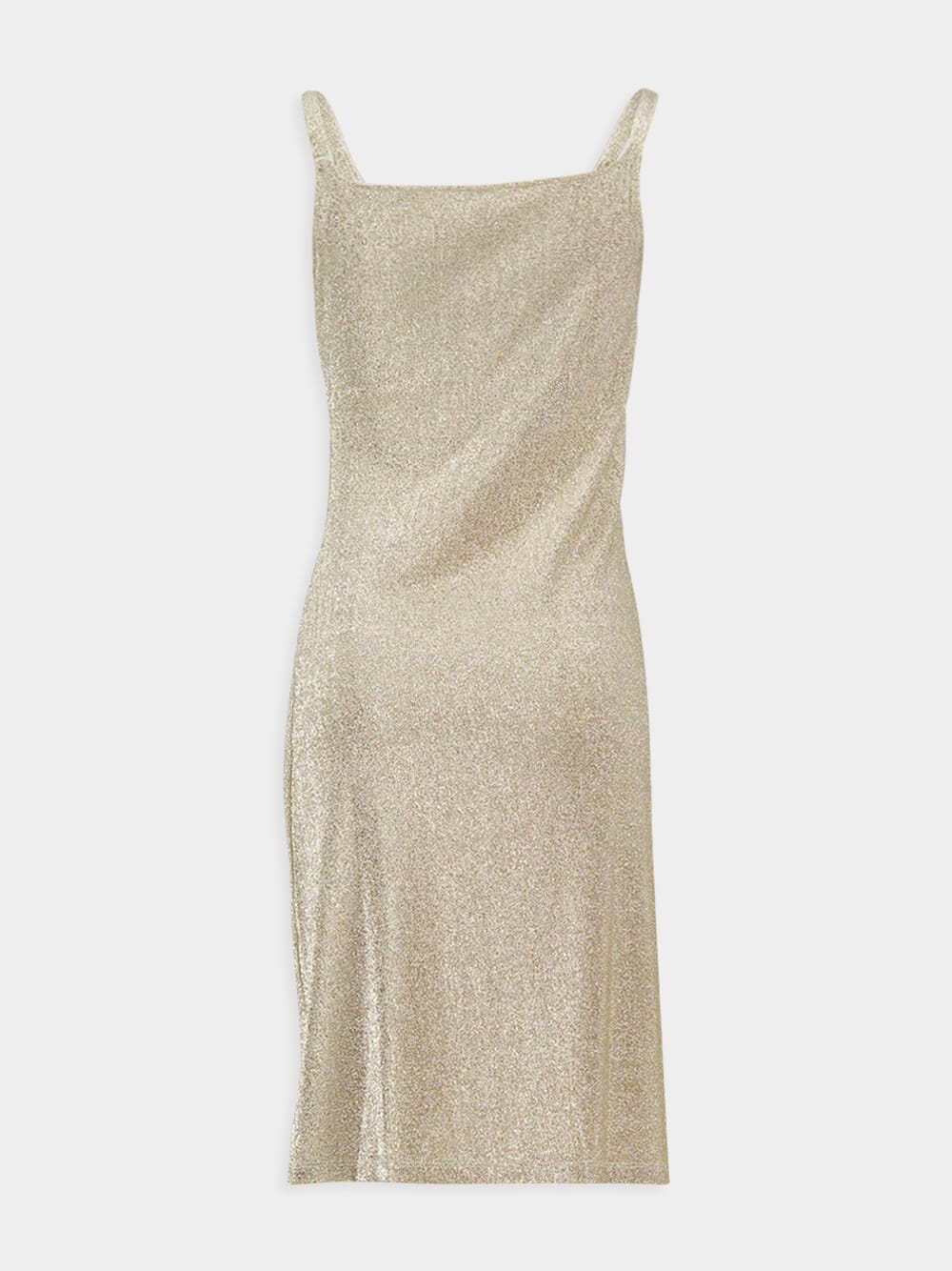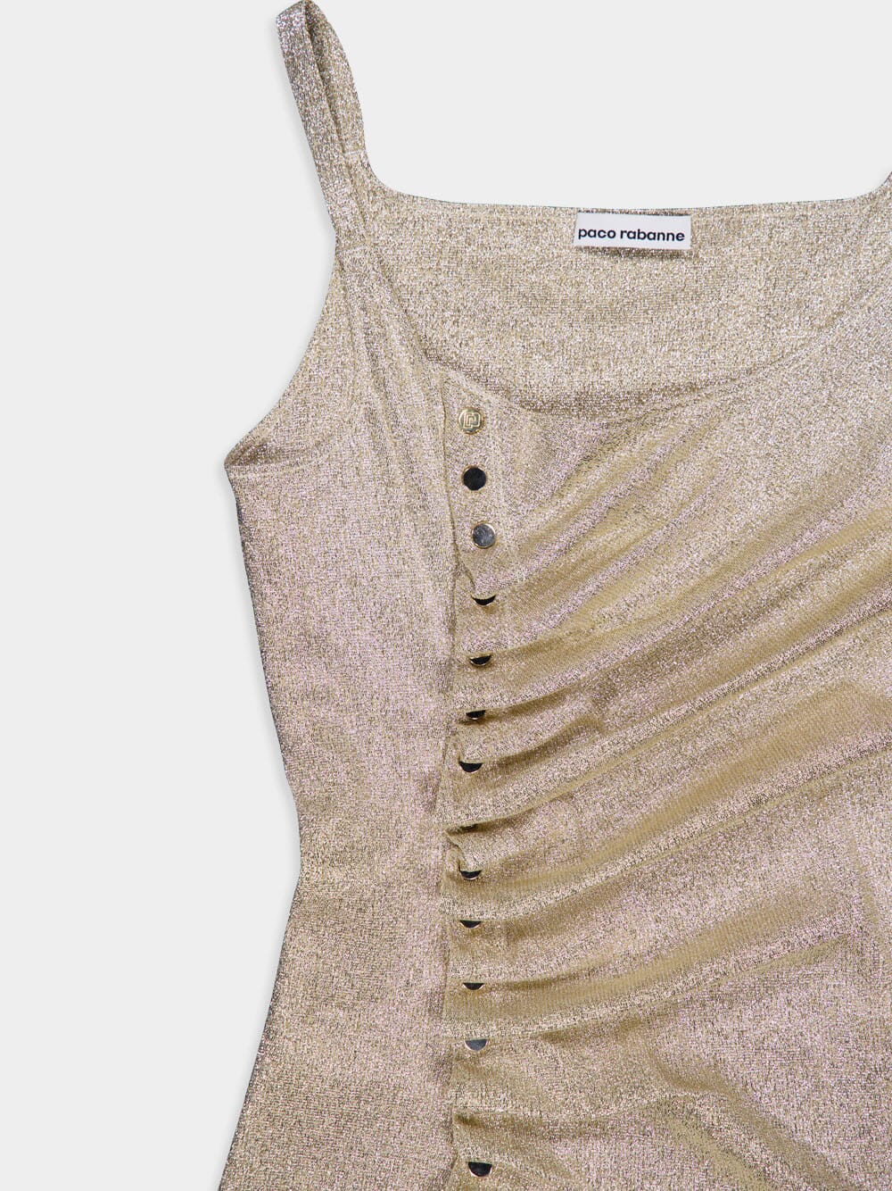 Draped Mini Dress, a show-stopping ensemble with a gold-tone metallic effect that exudes glamour. The ruched detailing adds texture and dimension, enhancing the dress's contemporary allure. Featuring a U-neck and sleeveless design, this dress is a perfect blend of sophistication and modern style.
