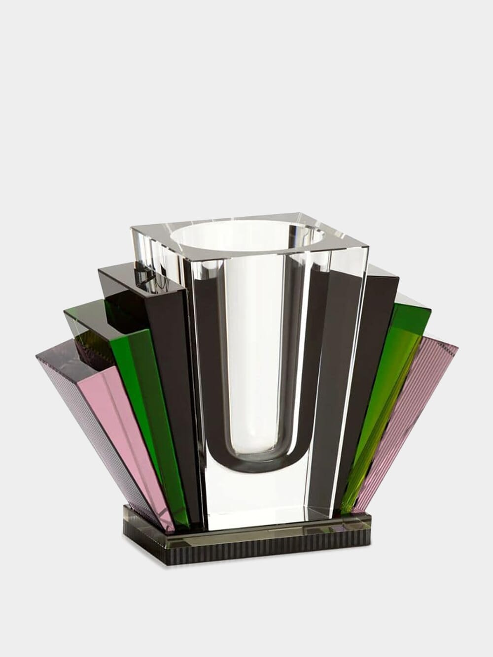 Harlem Crystal Vase, a captivating interplay of sleek, geometric Art Deco design. Clear central pillars elegantly fan out, adorned with angular pink, green, and black details, creating a stunning statement piece for your mantelpiece, dining table, or prominent shelf.