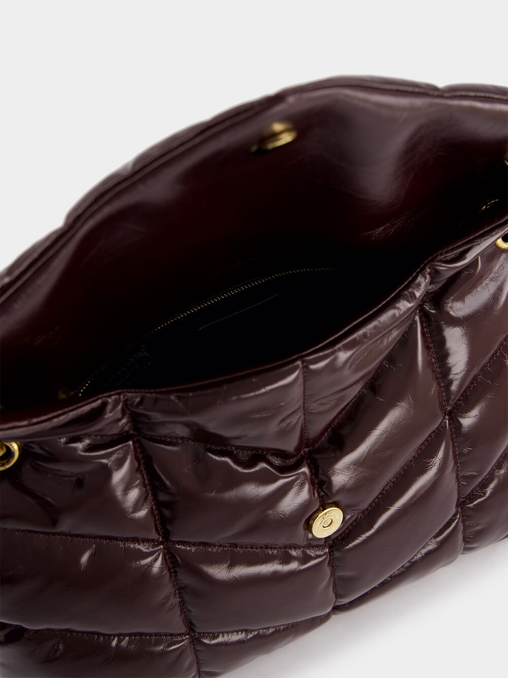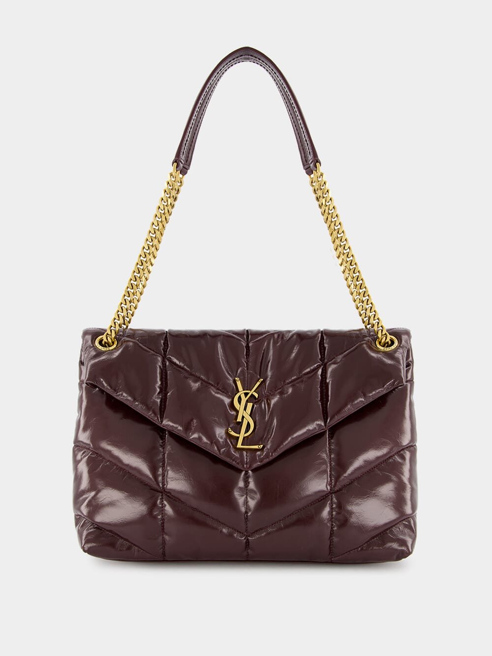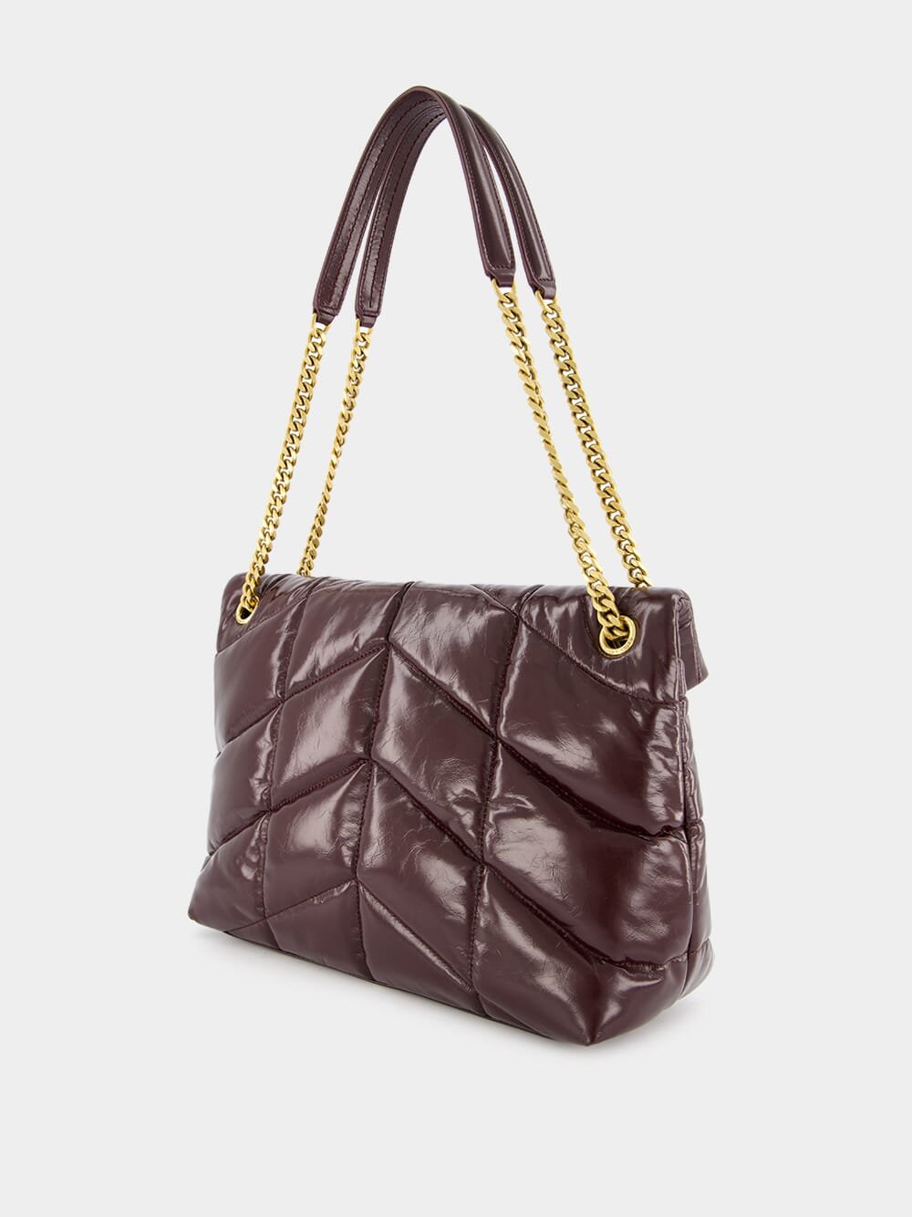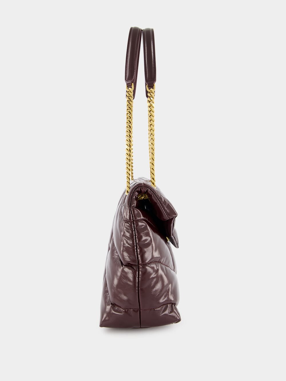 Puffer Crinkled Medium Leather Bag—a supple envelope-style adorned with exquisite chevron-quilted topstitching. Its versatile design, featuring a sliding leather-and-chain strap, allows for effortless shoulder or crossbody wear. With an organic cotton lining, bronze-toned hardware, and a magnetic snap closure, this bag seamlessly merges style and sustainability. The practicality extends with an interior zip pocket, making it an ideal companion for the fashion-forward with a penchant for functionality.