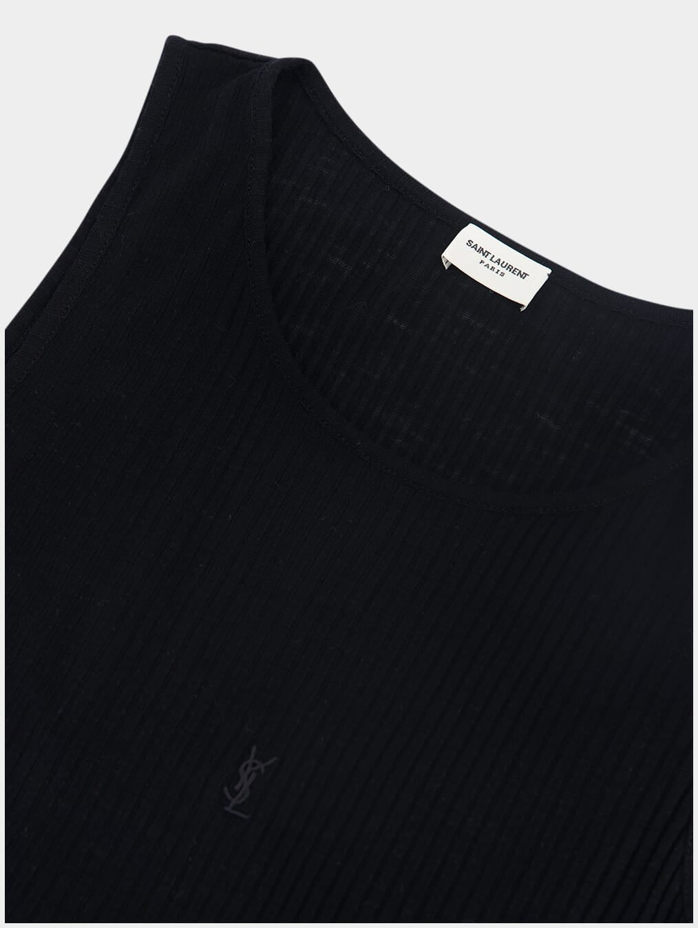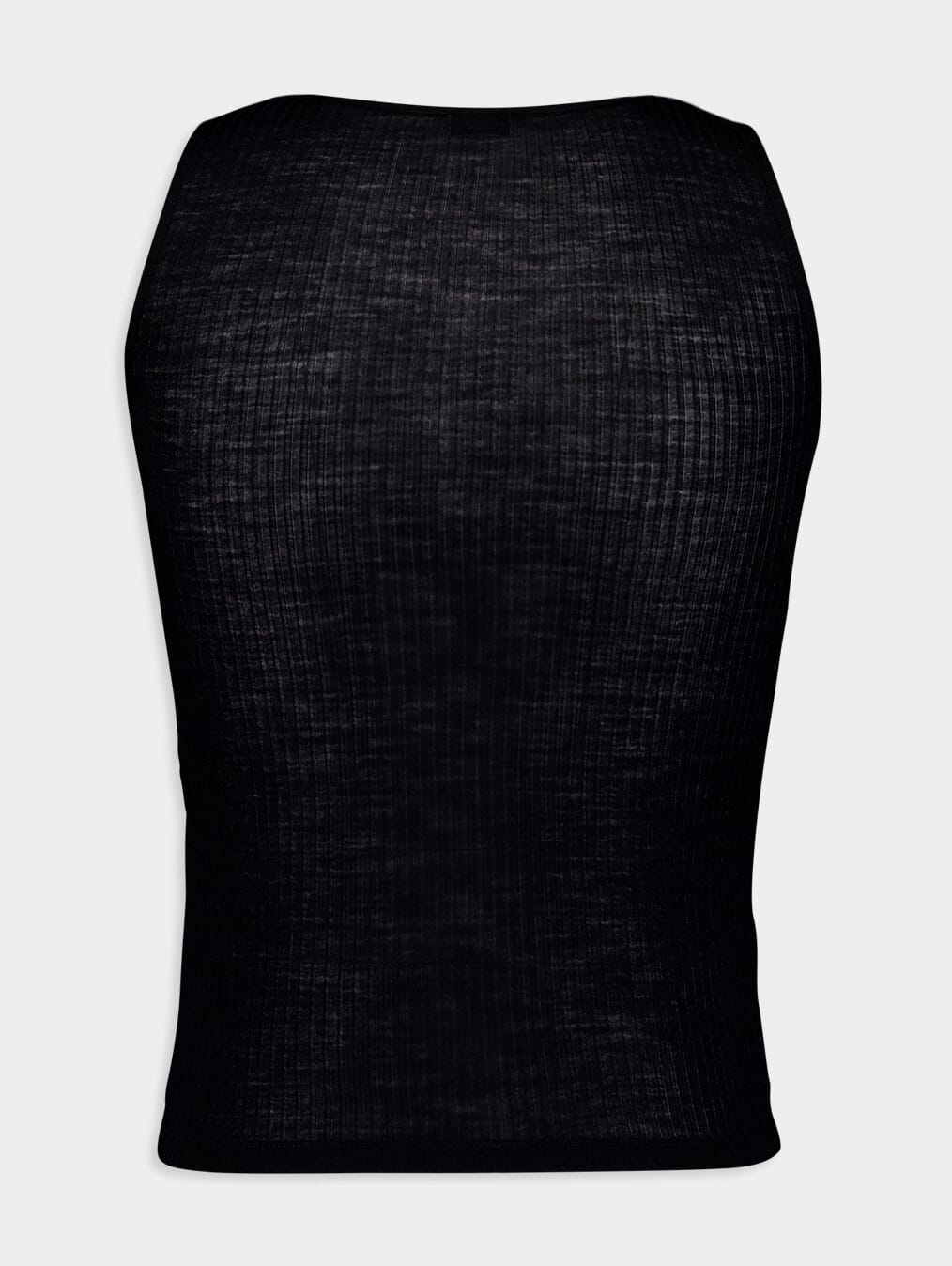 Cassandre Wool Tank Top, a semi-sheer ribbed masterpiece. This tank top features a chic round scoop neck and showcases the iconic Cassandre embroidery on the chest. Its timeless design is completed with a straight hem for a versatile and stylish look.