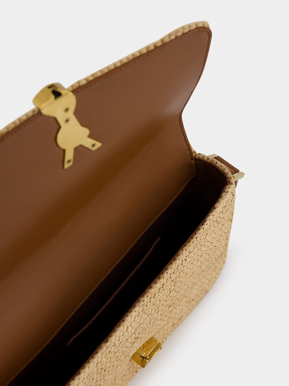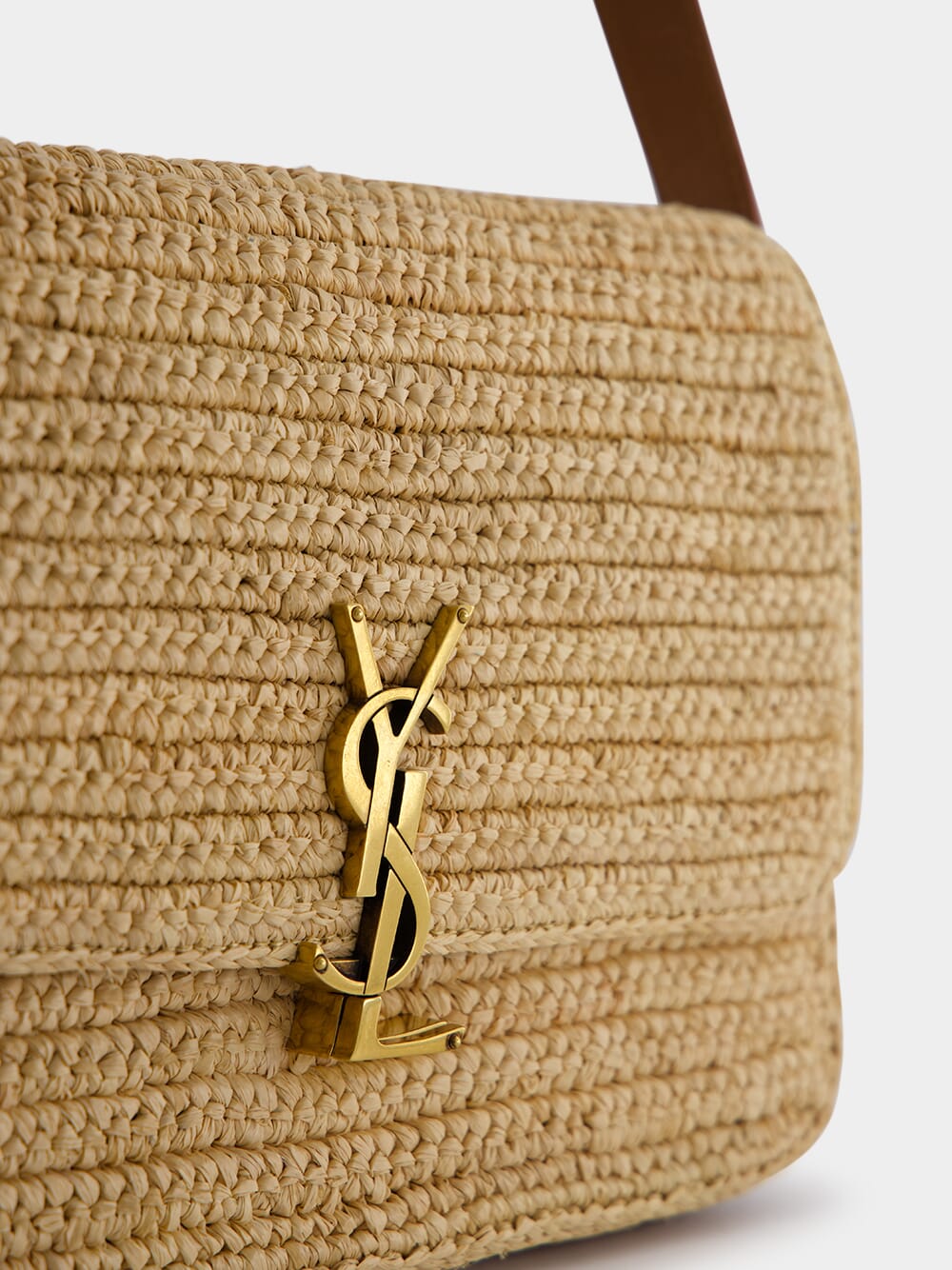 Solferino Raffia Shoulder Bag, featuring exquisite leather trim that adds a touch of luxury to your ensemble. Showcasing a signature YSL logo plaque, this bag is a true fashion statement. Its adjustable shoulder strap ensures comfort and versatility, while the foldover top with a magnetic fastening keeps your belongings secure. Inside, you'll find a spacious main compartment and an internal slip pocket for organization. Complete with elegant gold-tone hardware, this bag is the epitome of chic sophistication.
