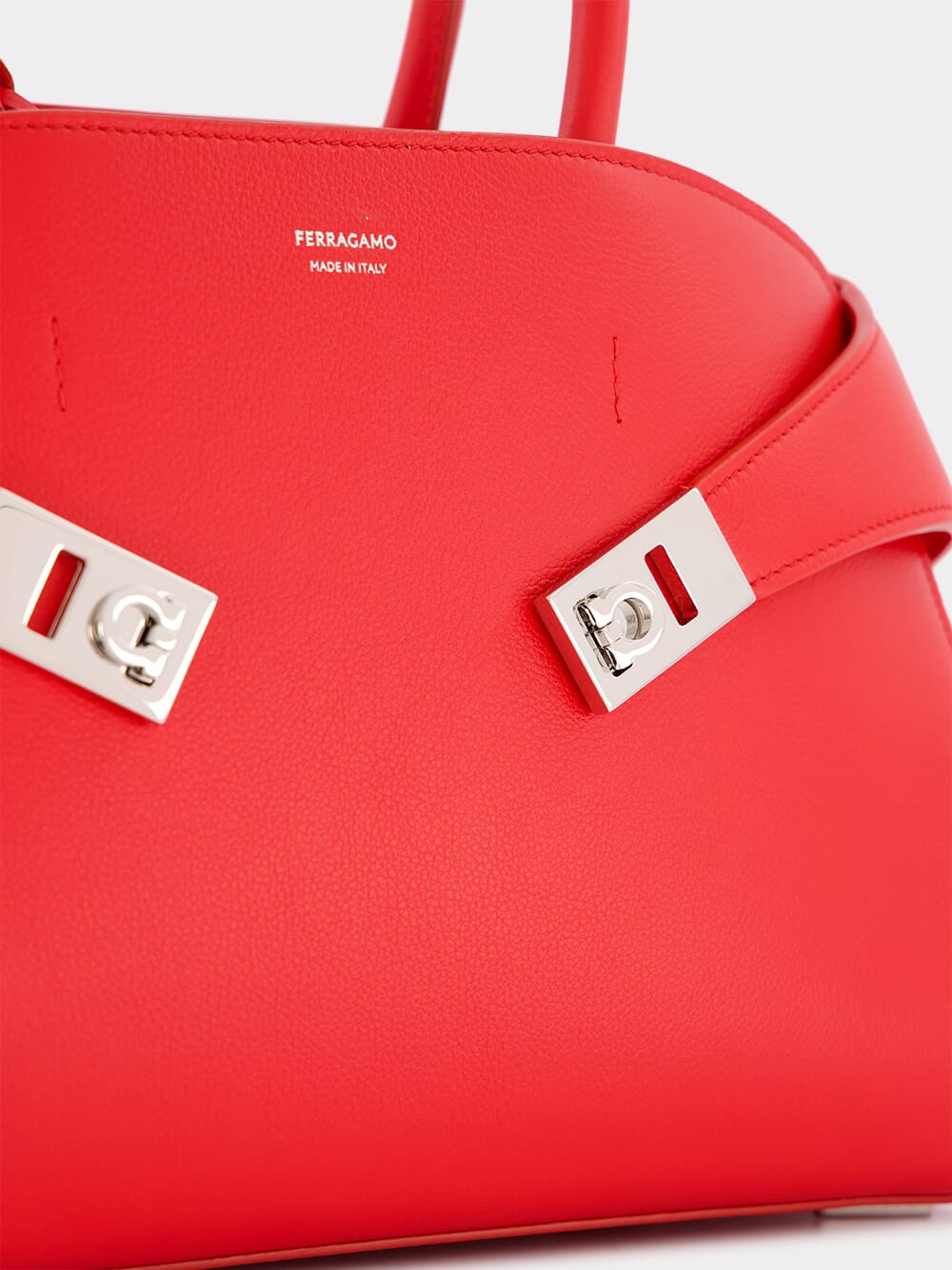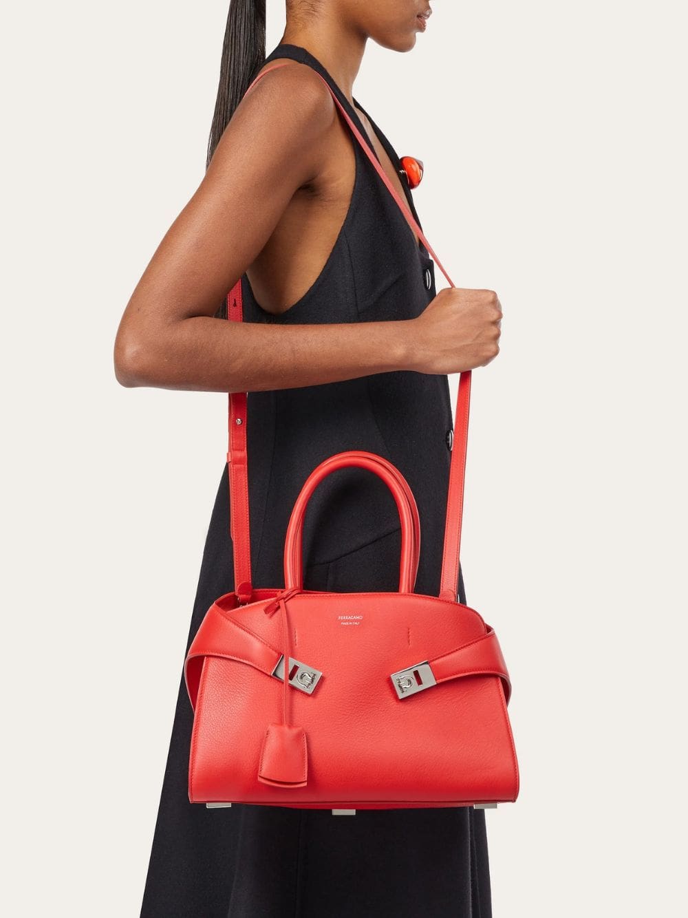 Small Hug Handbag, a retro-inspired gem with a soft structure and natural-grain calfskin panels. This compact version boasts an asymmetrical design with accordion sides fastened by palladium-finish Gancini buckles. The interior features a convenient ring closure, keyring charm, and a zip-lined pocket. Plus, the branded rectangular feet studs protect the base.