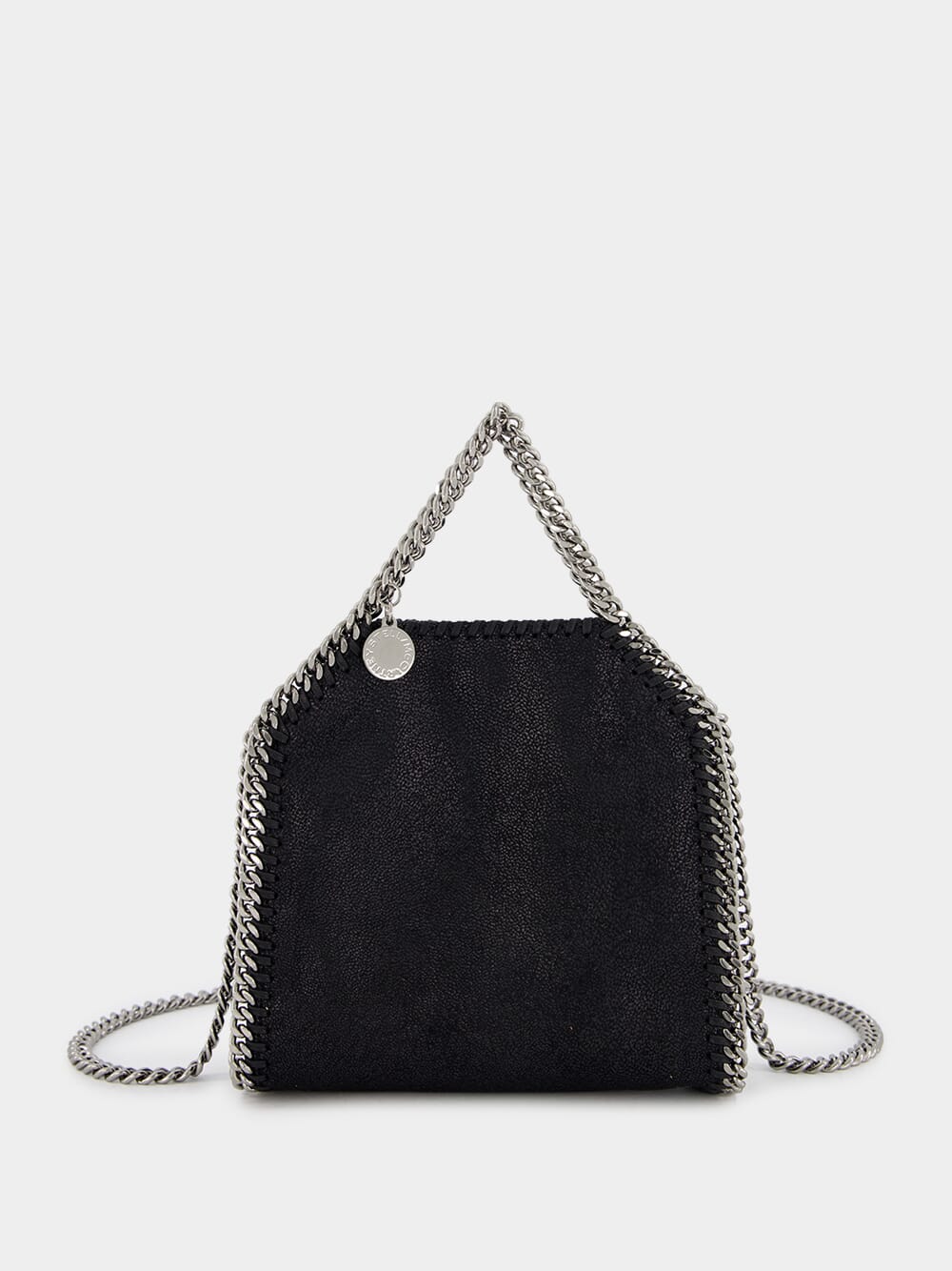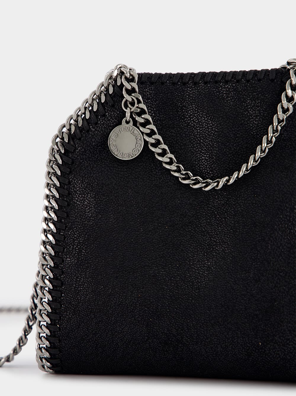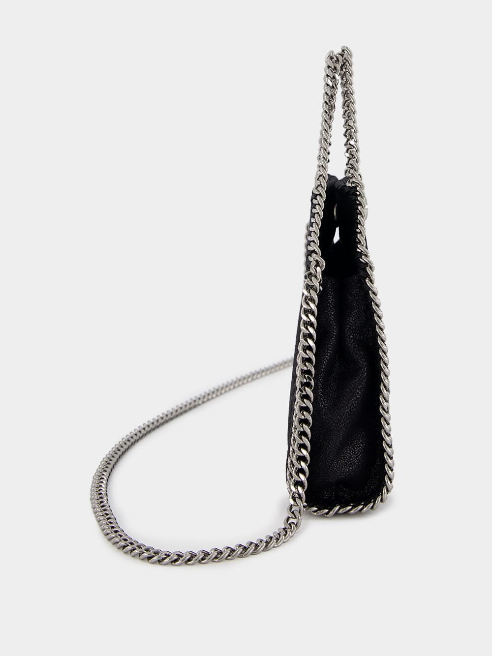 Stella McCartney Falabella tiny tote bag in black with signature silver diamon-cut chain with slip pocket and press-stud fastening.