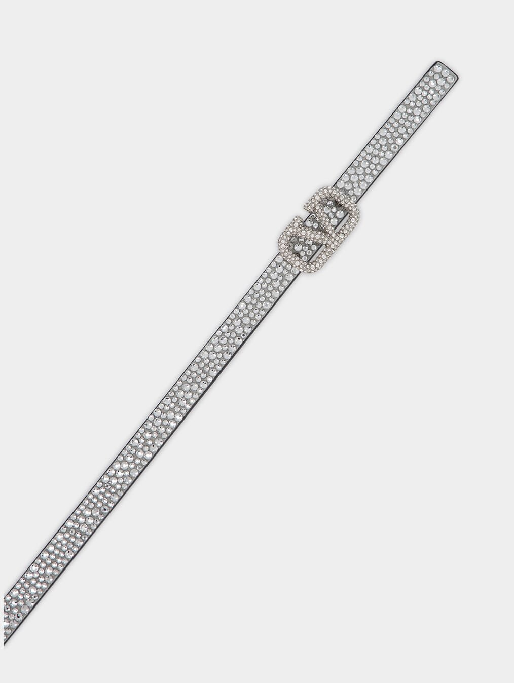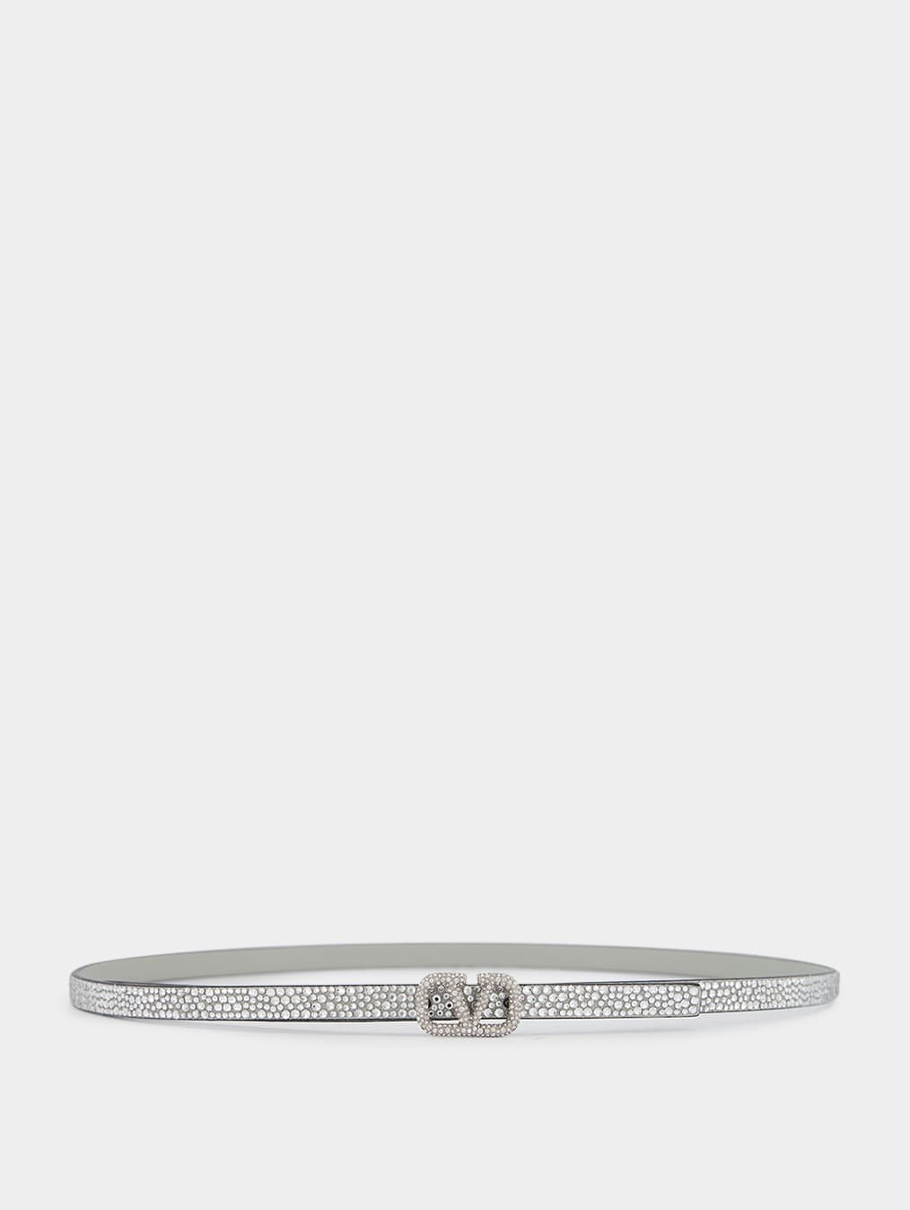 V-Logo Rhinestone-Embellished Belt, a dazzling accessory that's sure to turn heads. Featuring a signature V logo plaque adorned with sparkling rhinestones, this belt adds a touch of glamour to any outfit. The secure buckle fastening and punched holes ensure an adjustable fit, tailored to your comfort and style.
