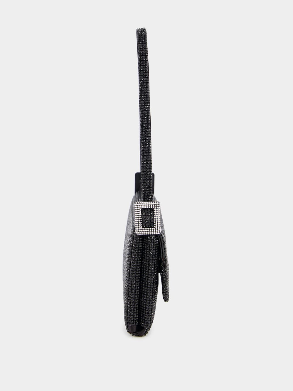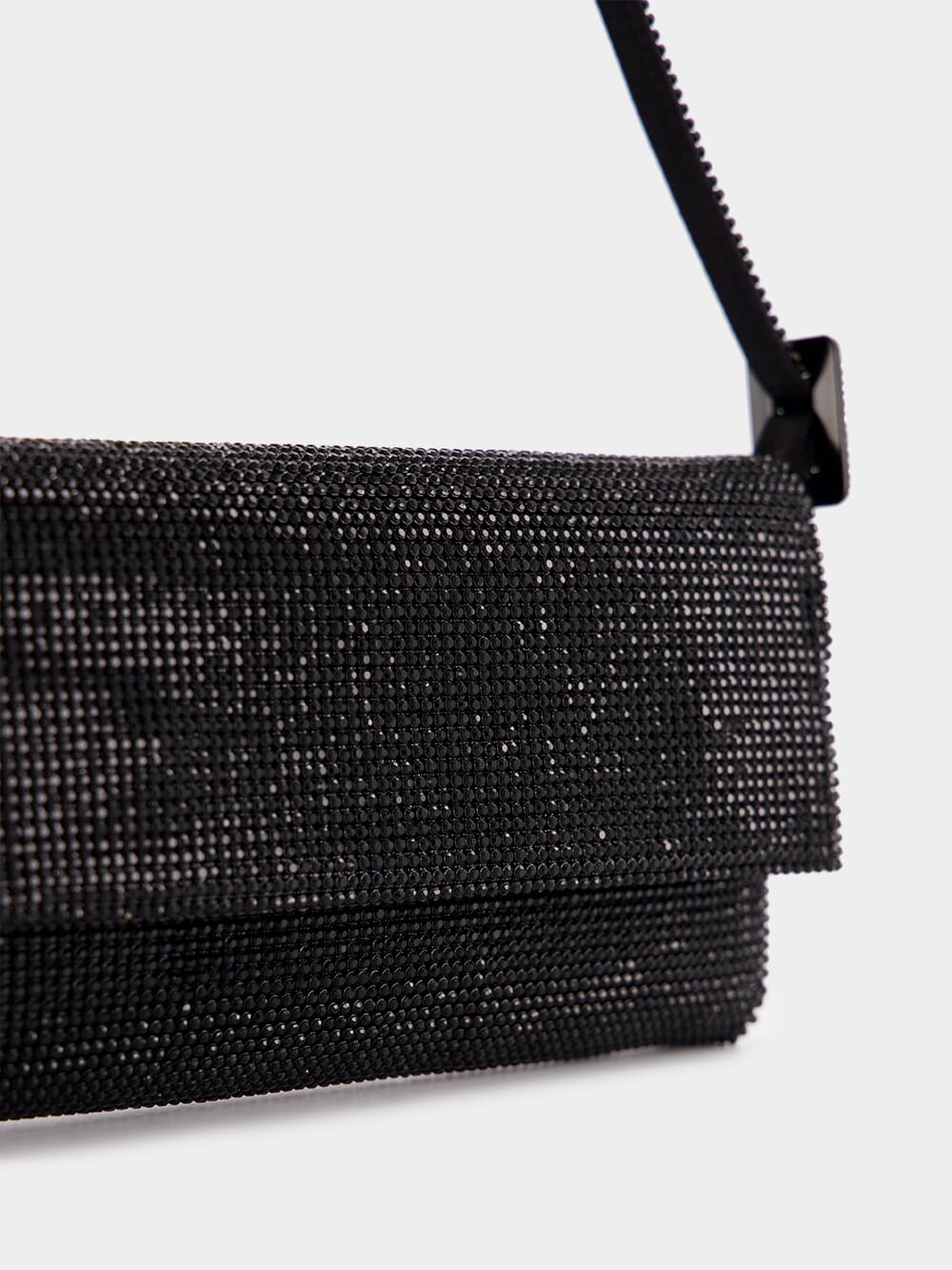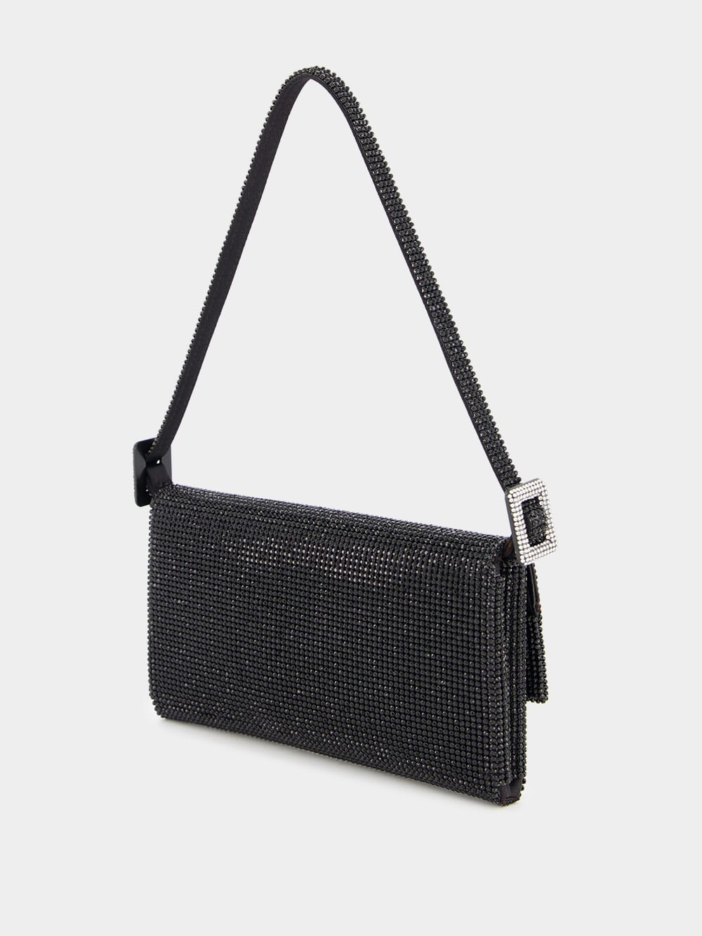 Vittissima Black Bag, a true fashion standout with exquisite crystal detailing. This bag boasts a contrast lining for a touch of sophistication and features an adjustable shoulder strap for personalized comfort. The foldover top with a secure magnetic fastening adds both security and style. Inside, you'll discover multiple internal slip pockets and a spacious main compartment, all luxuriously lined with silk.