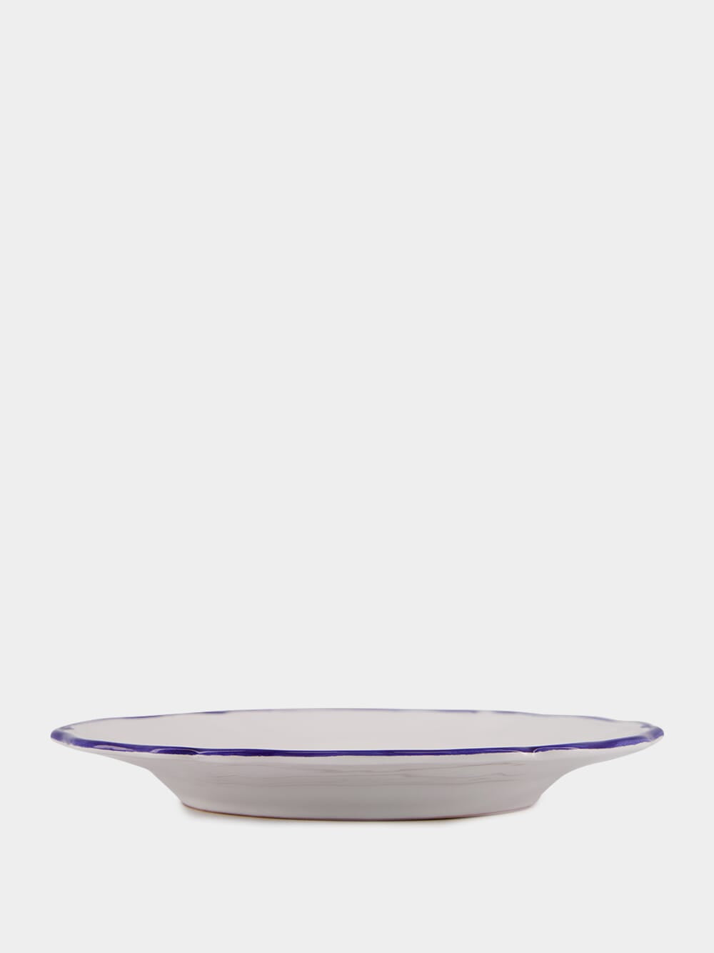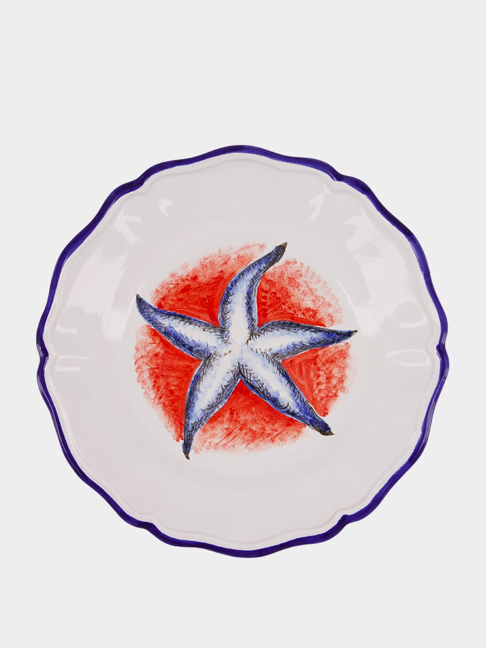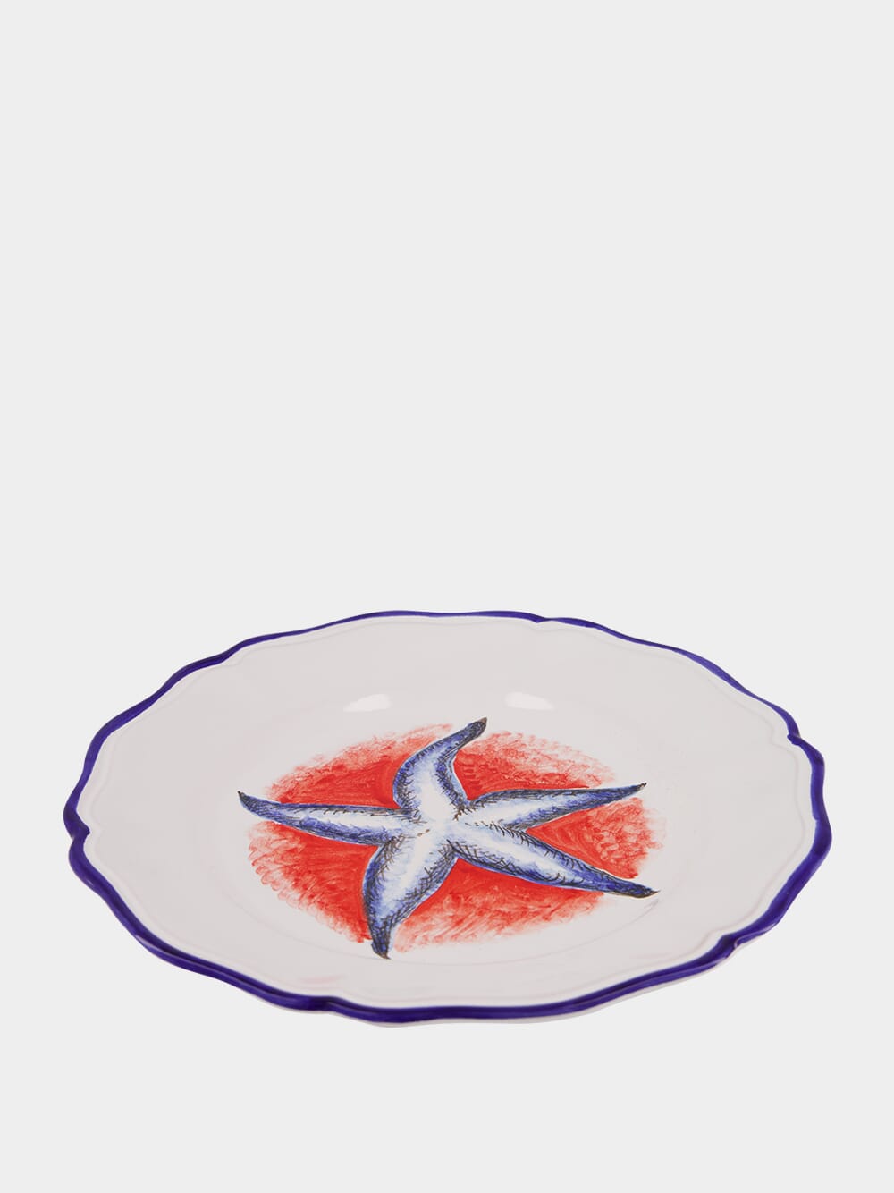 Les Ottomans La Menagerie D'ete collection, white ceramic dinner plate with blue trim and handpainted Seastar.